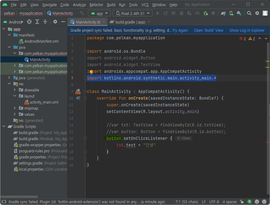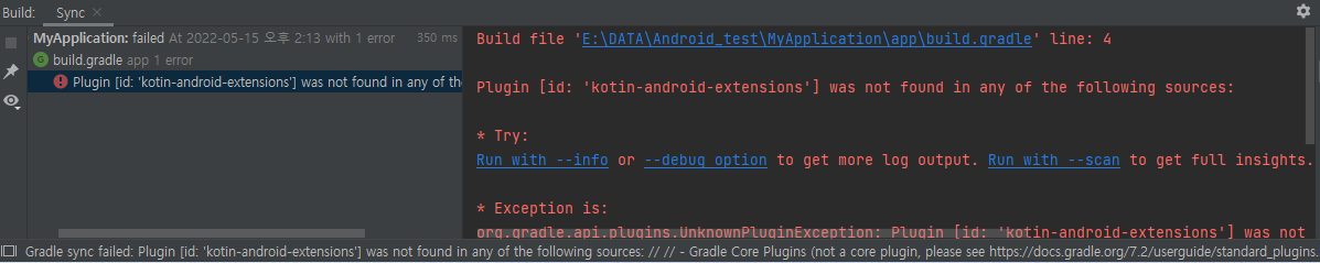 12. 그러나, kotlin-android-extensios 플러그 인 이 문제가 있는건지 찾을 수 없는건지 에러난다.