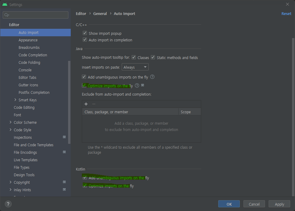 kotlin 에서 Add unambugous inports on the fly 와 Optimize imports on the fly 2곳에 체크 한다.