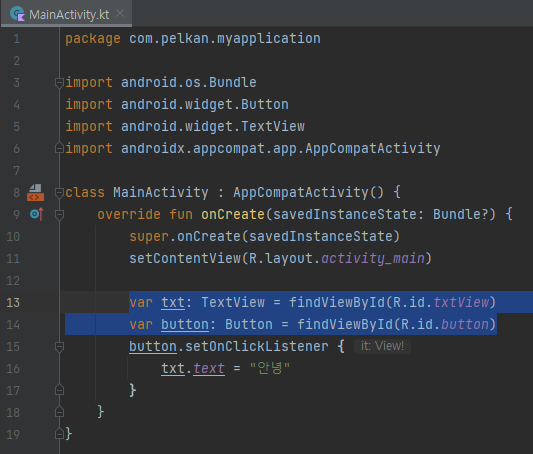 13. build.gradle 에서 id 'kotlin-android-extensios' 와 MainActivity.kt 에서
