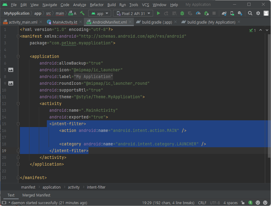 8. 프로그램 시작은 AndroidManifest.xml 의 <activity> 안에 <intent-filter> 에서 <action> 과 <catrgory> 를 가진 activity 에서 시작한다. 만약, MainActivity 가 아닌 다른 Activity 에서 시작하고 싶으면 <action> 과 <category> 2개 코드를 시작하고 싶은 Activity 로 이동하면 된다.