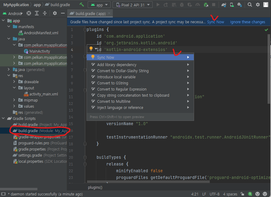 10. 자동 추가되도록 하려면 프로젝트에서 build.gradle(Module) 파일에서 4행과 같이 id 'kotlin-android-extensios' 를 입력하고 두 곳 중 하나에서 Sync Now 를 해야 한다.