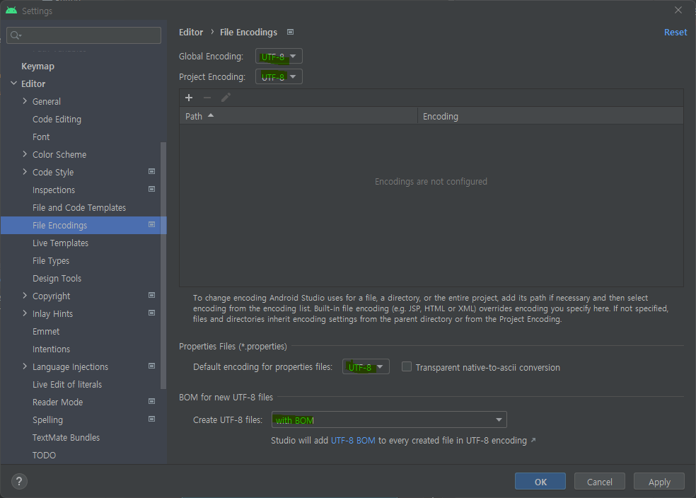 책에서는 with NO BOM 으로 하라는데 다른 블로그에서는 BOM 이 없으면 한글이 깨진다고 해서 with BOM 선택한다.