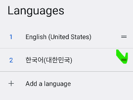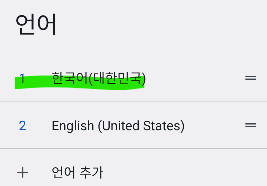 H. 한국어가 추가되었고 우측 이동 아이콘(위 그림 녹색) 을 위로 드래그해서 한국어가 1번이 되도록 한다.