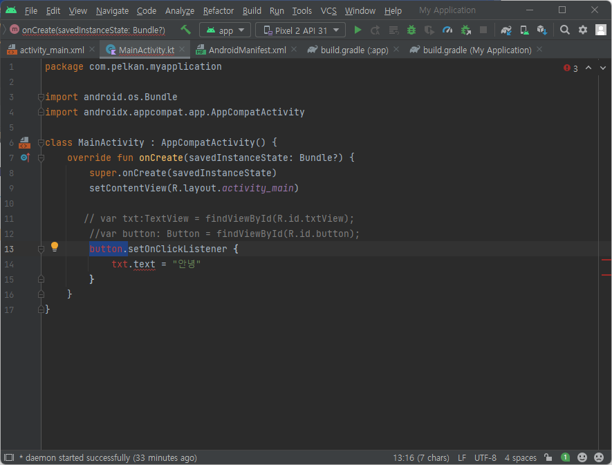 11. MainActivity.kt 에서 7행을 입력하면 에러 없이 입력이 된다. (만약, Sync Now 하지 않고 입력하면 7행에서 에러난다.) 16행 button 도 에러가 사라진다.