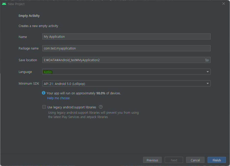 Language 에서 Kotlin 선택하고 Finish 버튼 클릭하면 새 프로젝트가 만들어 진다.