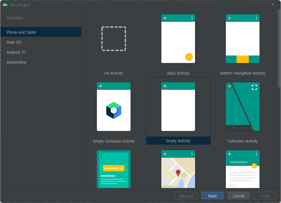 7. 새 프로젝트를 Empty Activity 로 만든다.