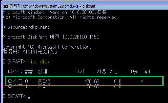 그러면 디스크 목록이 나오며, Gtp 아래에 * 표시가 있으면 GPT 방식이고 없으면 MBR 방식이다.