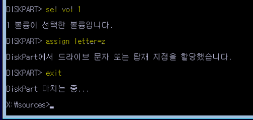 볼륨 1 에 드라이브 문자 z 를 지정하고 디스크 관리자에서 나온다.