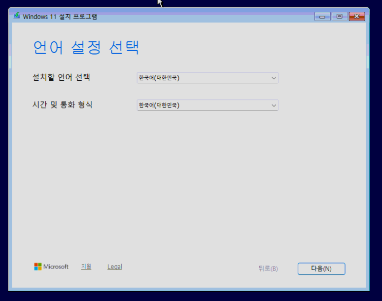 1. 윈도우11 설치 USB 로 부팅하여 아래 그림이 나온다.