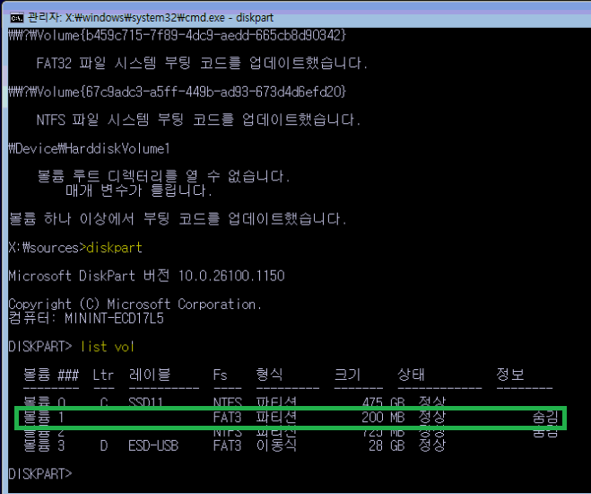 정보 아래에 숨김 속성을 가진 파티션 중 200MB 의 볼륨 번홀르 확인한다. (볼륨 1)