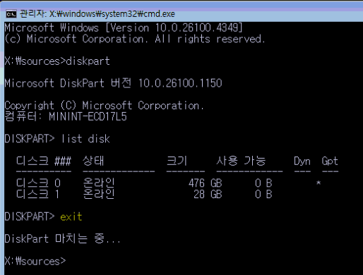 5. exit 를 입력하여 디슼 관리자에서 나온다.