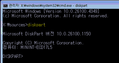 만약, MBR 방식이면 아래 순서대로 입력한다. (diskpart 사용 안함)
