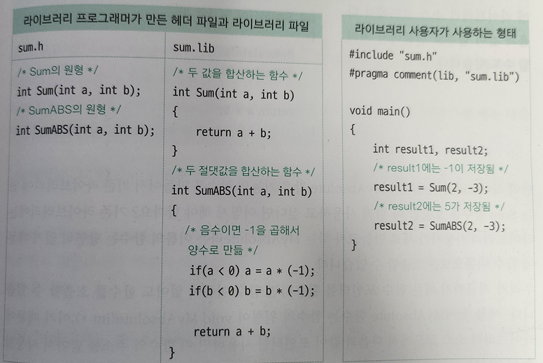 고 생각해 봅시다. 그러면 라이브러리 사용자에게는 파일 내부를 볼 수 없는 라이브러리 파일 sum.lib와 라이브러리 파일을 설명하는 헤더 파일 sum.h를 모두 제공해야 합니다.