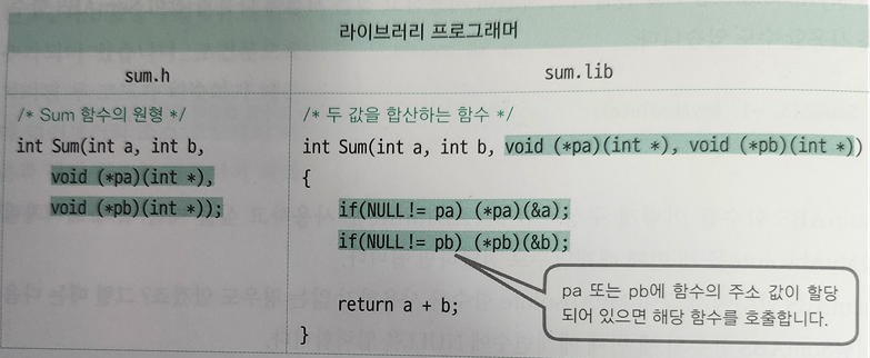 하지만 위에서 설명한 구조는 초보 프로그래머들에게 어려율 수밖에 없습니다. sum.lib를사용하는 사용자 입장에서는 당연히 Sum 함수 내부의 소스 코드를 볼 수 없습니다. 그렇기 때 문에 라이브러리를 사용하는 프로그래머의 소스 코드에는 MvAbsolute 함수가 구현만 되어있지 실제로 언제, 어떻게 호출되는지 알 수 없습니다. 즉 Sum 함수가 적절한 시점에 매개변수로 전달된 MyAbsolute 함수를 호출해서 결과 값을 만들어 준다고 예상만 할 뿐입니다.